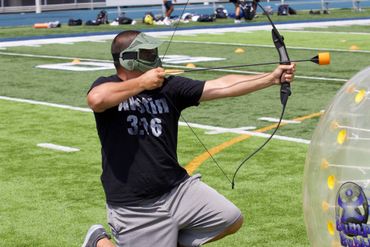 Archery Tag is a unique twist on the traditional game of dodgeball. Players now use foam-tipped arrows and recurve bows to get opponents out, while staying safe behind bunkers. For Archery tag rentals, we ask that you have a space around 50 feet x 100 feet, although we have used smaller spaces. The age limit is 13 and older to use our bows.